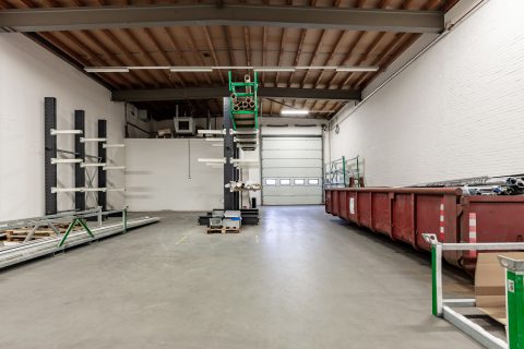 Mooie ruime hoge bedrijfshal met twee elektrisch bedienbare overhead deuren.
